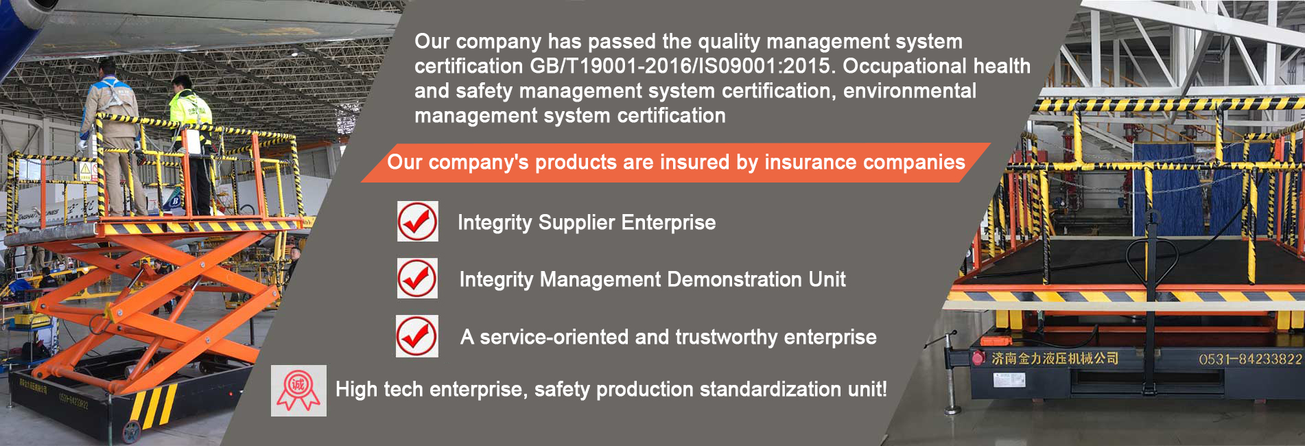 Jinan Jinli Hydraulic Machinery Co., Ltd. has been dedicated to the research and development of elevators for 20 years. Over the past 20 years, we have independently developed multiple core technologies for elevators, and every elevator we manufacture meets the quality requirements of the General Administration of Quality Supervision, Inspection and Quarantine. In recent years, the company has been awarded the title of "City level Civilized Unit" by the Jinan Municipal Party Committee and Government; The Municipal Administration for Industry and Commerce awarded the title of "Contract abiding and Creditworthy Enterprise"; The company is currently the "Graduate Internship Base of Beihang University".