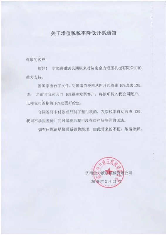 Dear customers, starting from April 1st, the national value-added tax rate will be changed from 16% to 13%. Please: If you have signed a contract with our company with a 16% tax rate in the early stage, please arrange to pay the full contract amount before the 25th of this month so that our company can issue a tax rate of 16% in the near future.