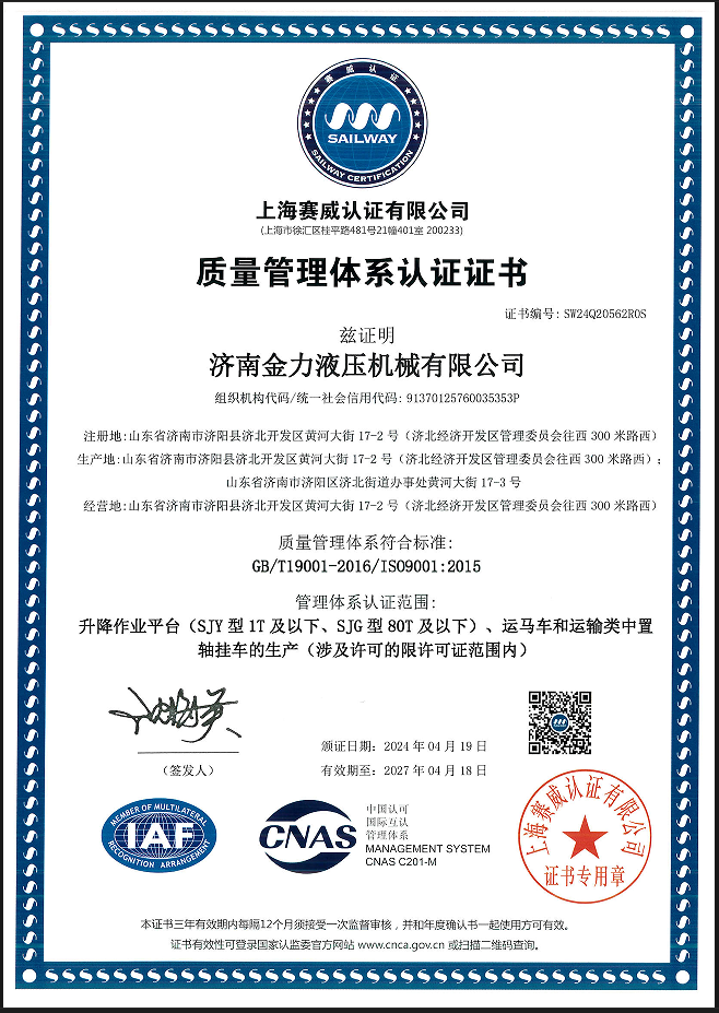 Congratulations to Jinan Jinli Hydraulic Machinery Co., Ltd. for obtaining the 9001 Quality Management System Certification on April 26, 2024! This is a very important achievement, indicating that the company's quality management system complies with international standards and is able to continuously improve and enhance the quality of its products and services.